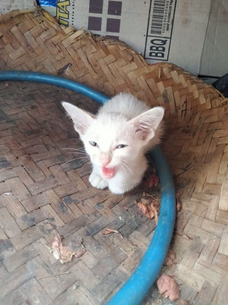 Usut punya usut, ternyata rumahku kehadiran seekor kucing betina. Ia putih sebersih salju, dengan beberapa jejak hitam di atas kepalanya, layaknya jambul. Matanya heterokromia, seperti Hoshino dalam gim Blue Archive. Aku tidak tahu pasti berapa umur kucing tersebut, meski aku menduga ia masih berumur satu bulan.